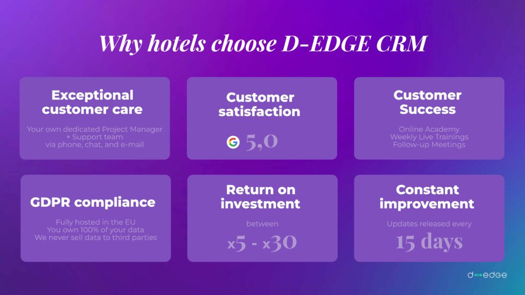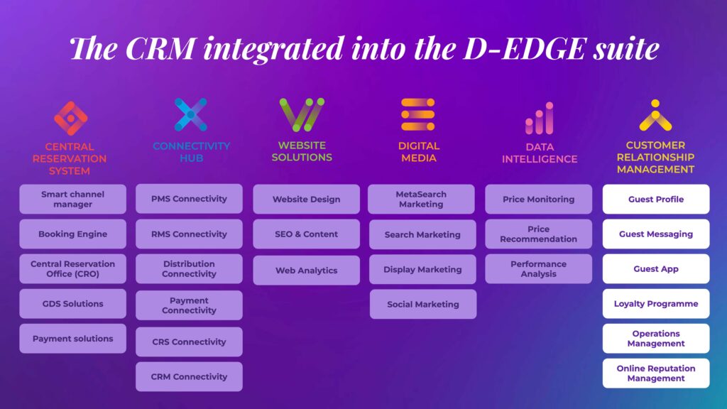 D-EDGE CRM est une solution tout-en-un qui relie et personnalise le parcours client tout en rationalisant les opérations et en augmentant les revenus de plus de 3 000 prestataires d’hébergement, des hôtels indépendants 4 étoiles aux grands groupes et complexes hôteliers.